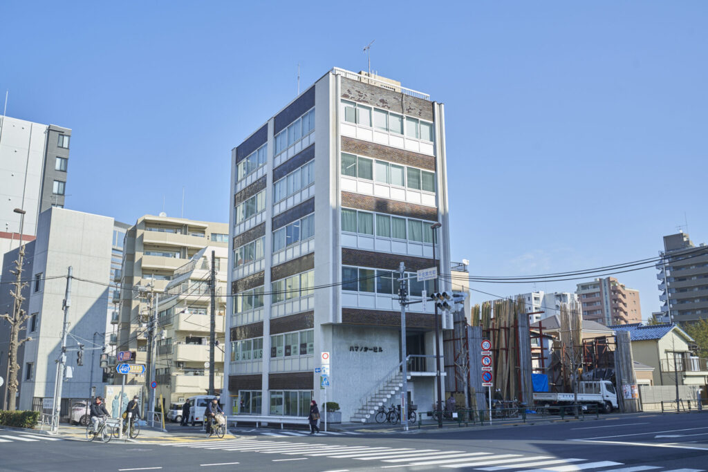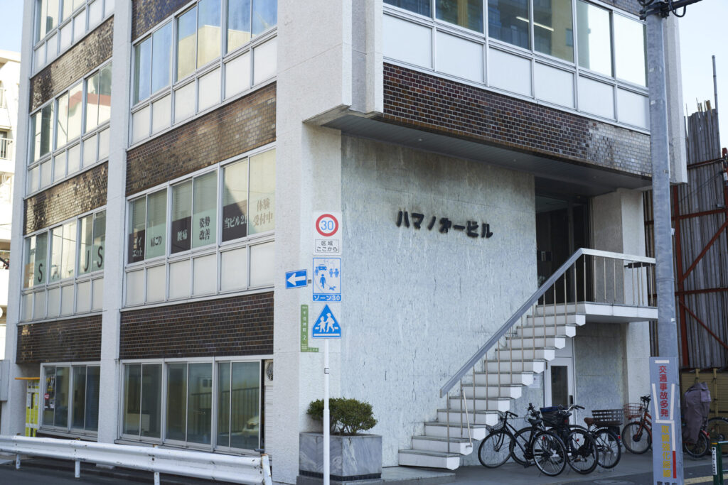 目の前に見えるビルが『ハマノ第一ビル』となり、当店が入居するビルとなります。
